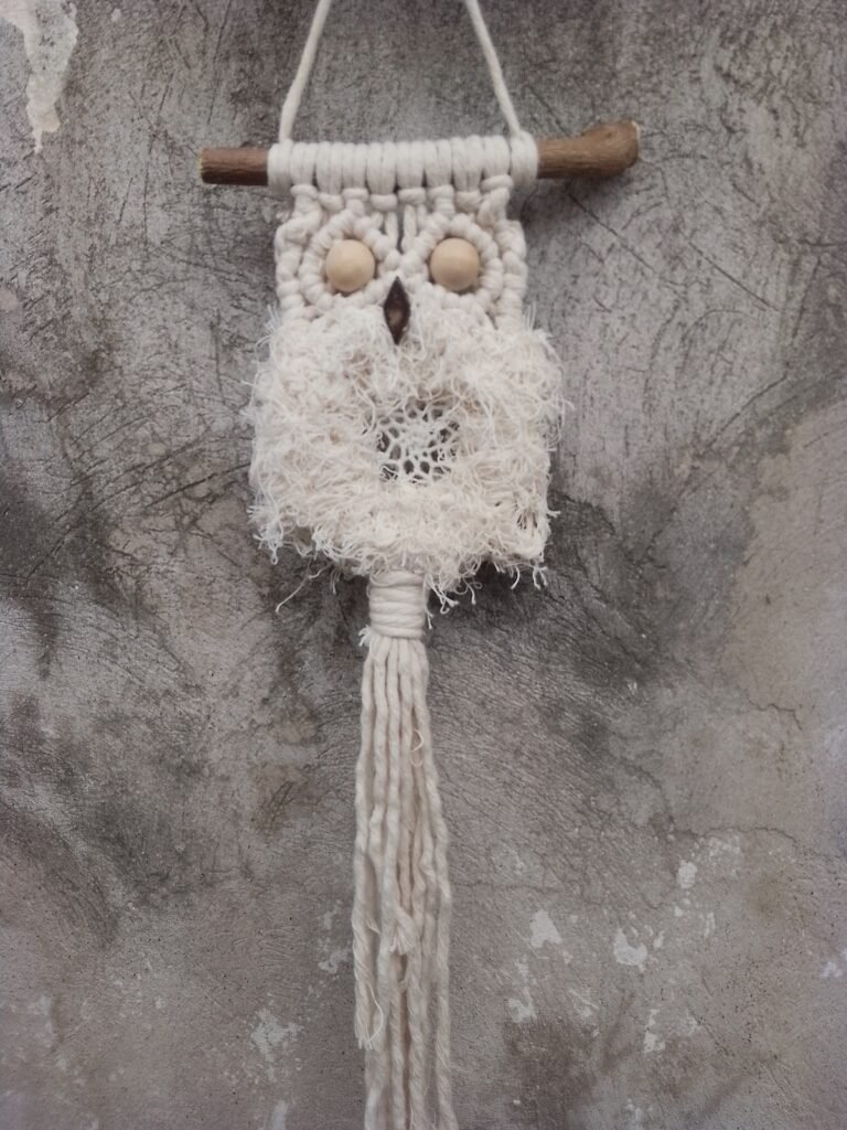 Buho de diseño, realizado en totora con tecnicas de Atrapa Sueños y Macrame.