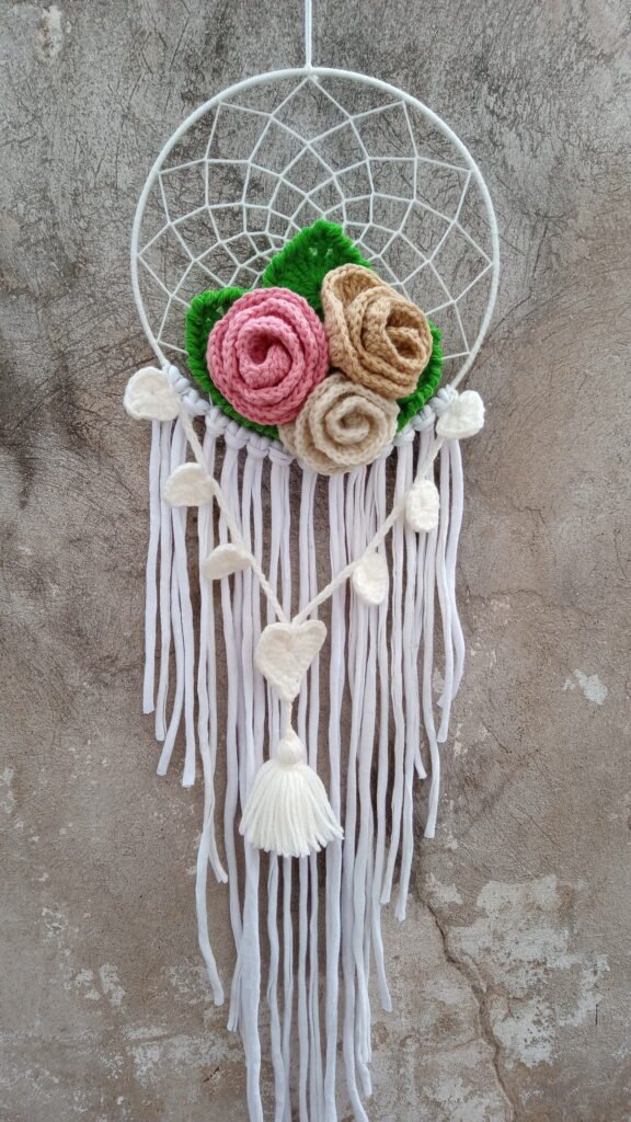 Atrapa sueño de diseño, realizado en lana. Acompañado de bouquet de Rosas, tejido a mano en Crochet con lanas.