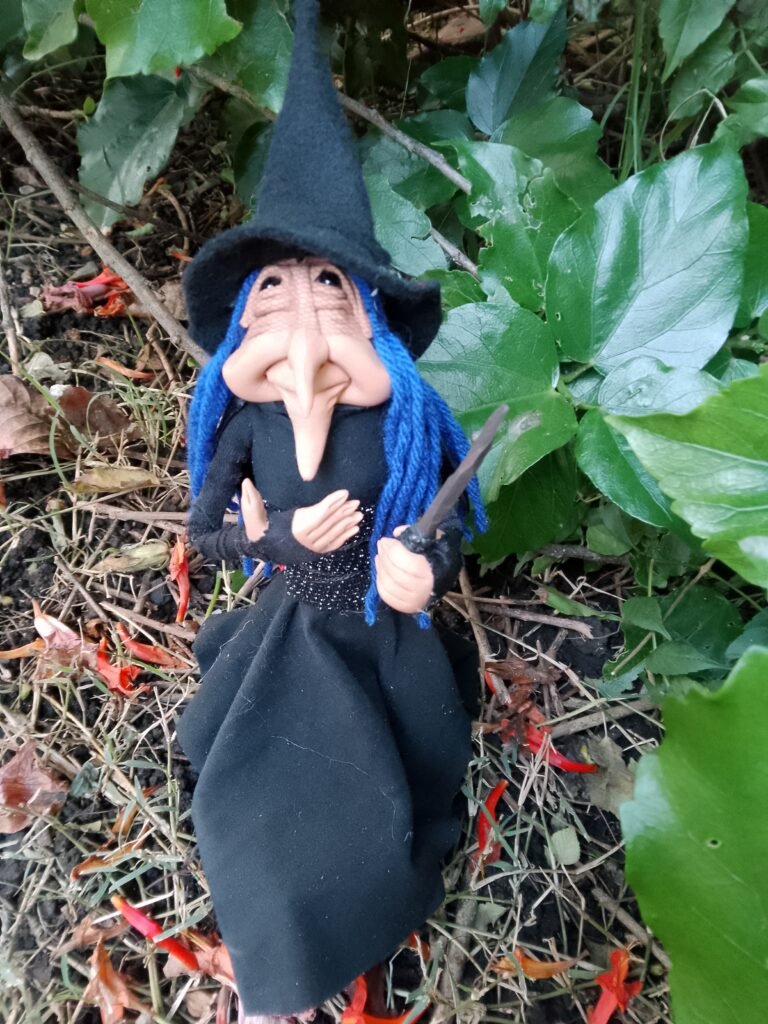 Bruja articulada, realizada a mano en porcelana fria, con alma de alambre, vestida en telas y lanas.