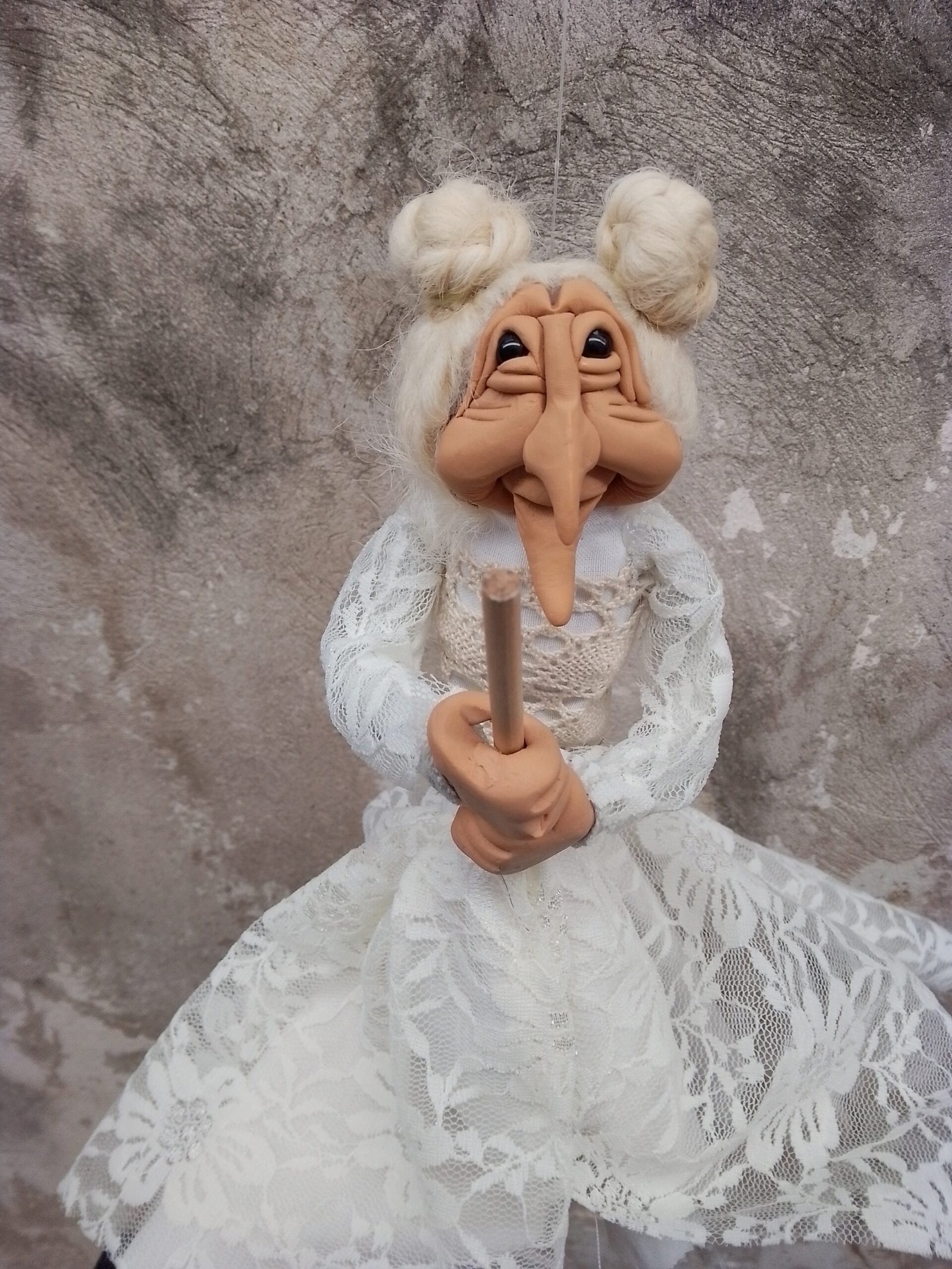 Bruja voladora, realizada a mano en porcelana fria, con alma de alambre, vestida en telas y lanas.