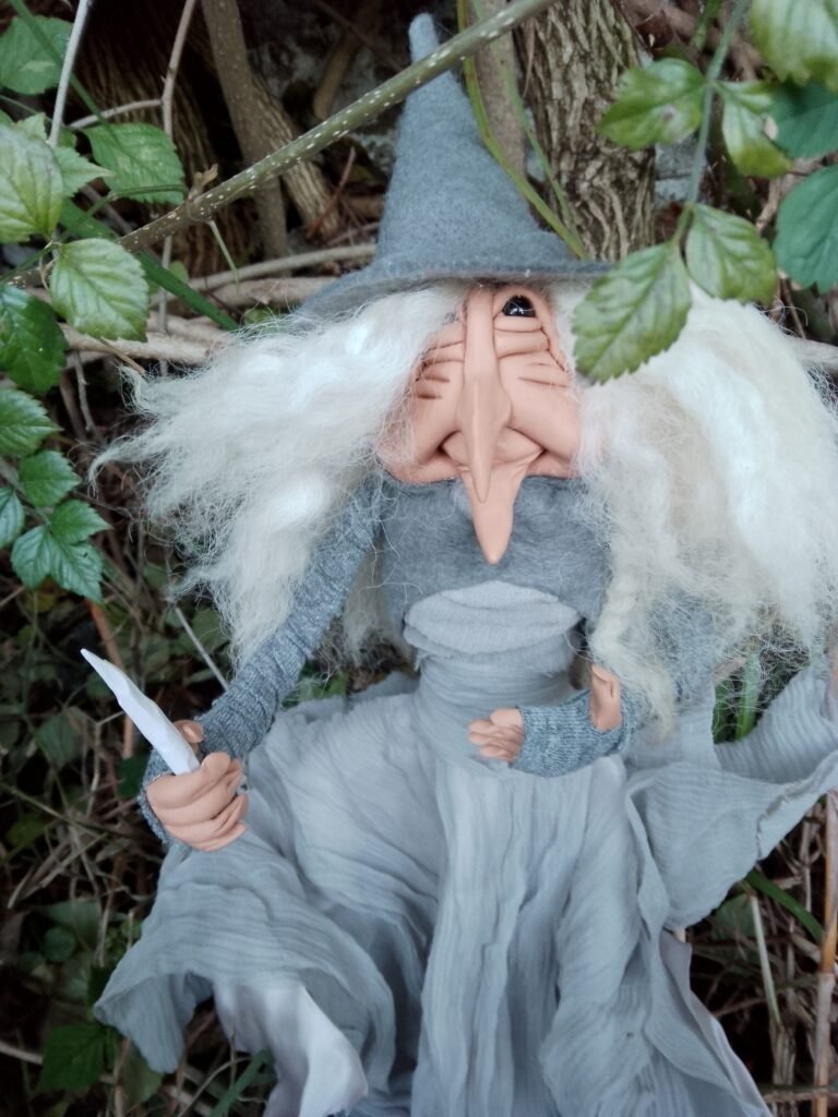 Bruja articulada, realizada a mano en porcelana fria, con alma de alambre, vestida en telas y lanas.
