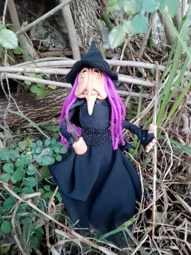 Bruja articulada, realizada a mano en porcelana fria, con alma de alambre, vestida en telas y lanas.