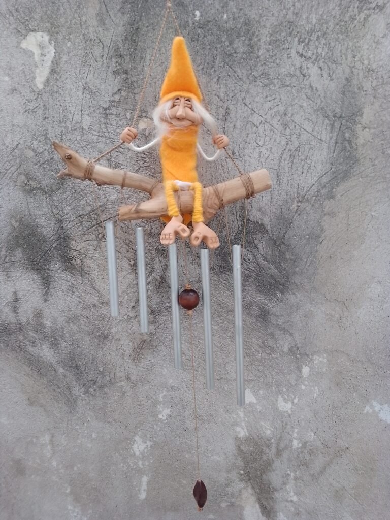 Duende articulado realizado a mano, en porcelana fria con alma de alambre, y vestido con telas. Acompañado de Llamador del Viento.