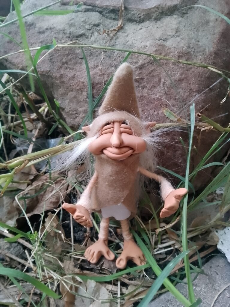 Duende articulado realizado a mano, en porcelana fria con alma de alambre, y vestido con telas.