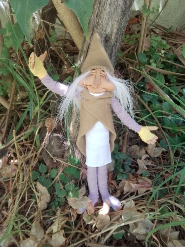 Duende articulado realizado a mano, en porcelana fria con alma de alambre, y vestido con telas.