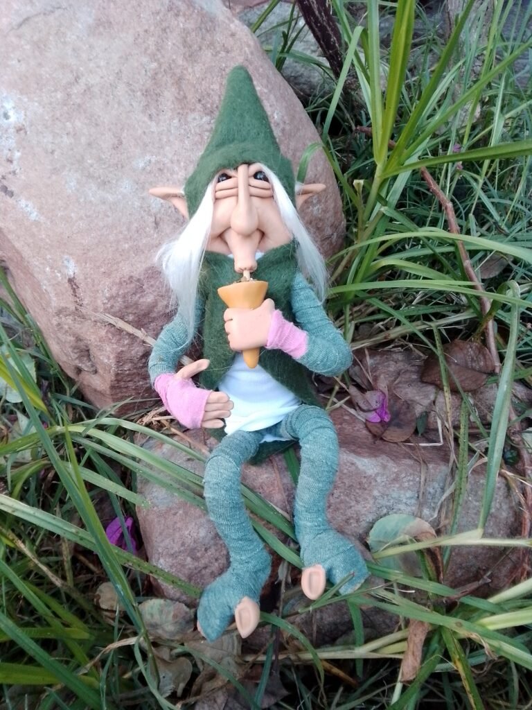 Duende articulado realizado a mano, en porcelana fria con alma de alambre, y vestido con telas.
