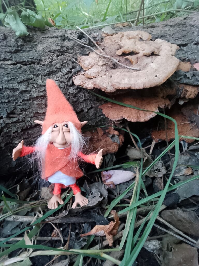 Duende articulado realizado a mano, en porcelana fria con alma de alambre, y vestido con telas.