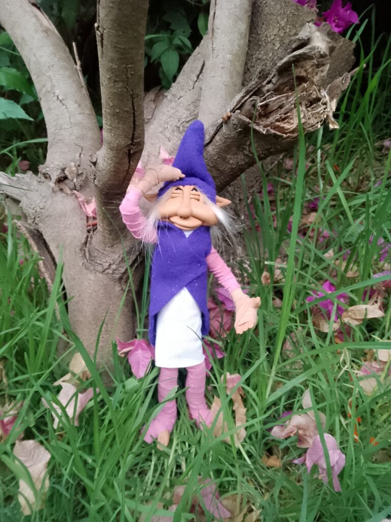 Duende articulado realizado a mano, en porcelana fria con alma de alambre, y vestido con telas.