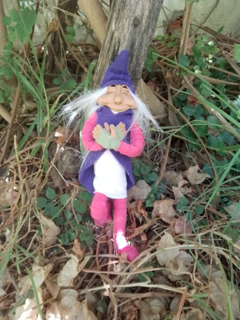 Duende articulado realizado a mano, en porcelana fria con alma de alambre, y vestido con telas.