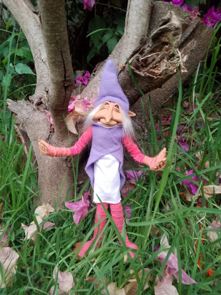 Duende articulado realizado a mano, en porcelana fria con alma de alambre, y vestido con telas.