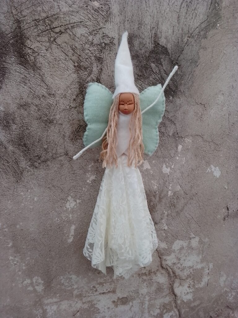Hada voladora articulada, realizada a mano en porcelana fria, con alma de alambre, vestida en telas y lanas.