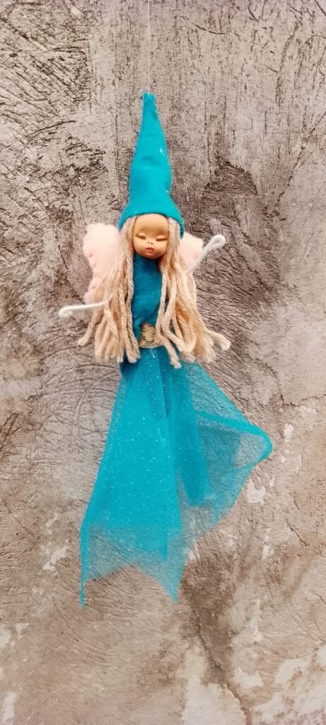 Hada voladora articulada, realizada a mano en porcelana fria, con alma de alambre, vestida en telas y lanas.