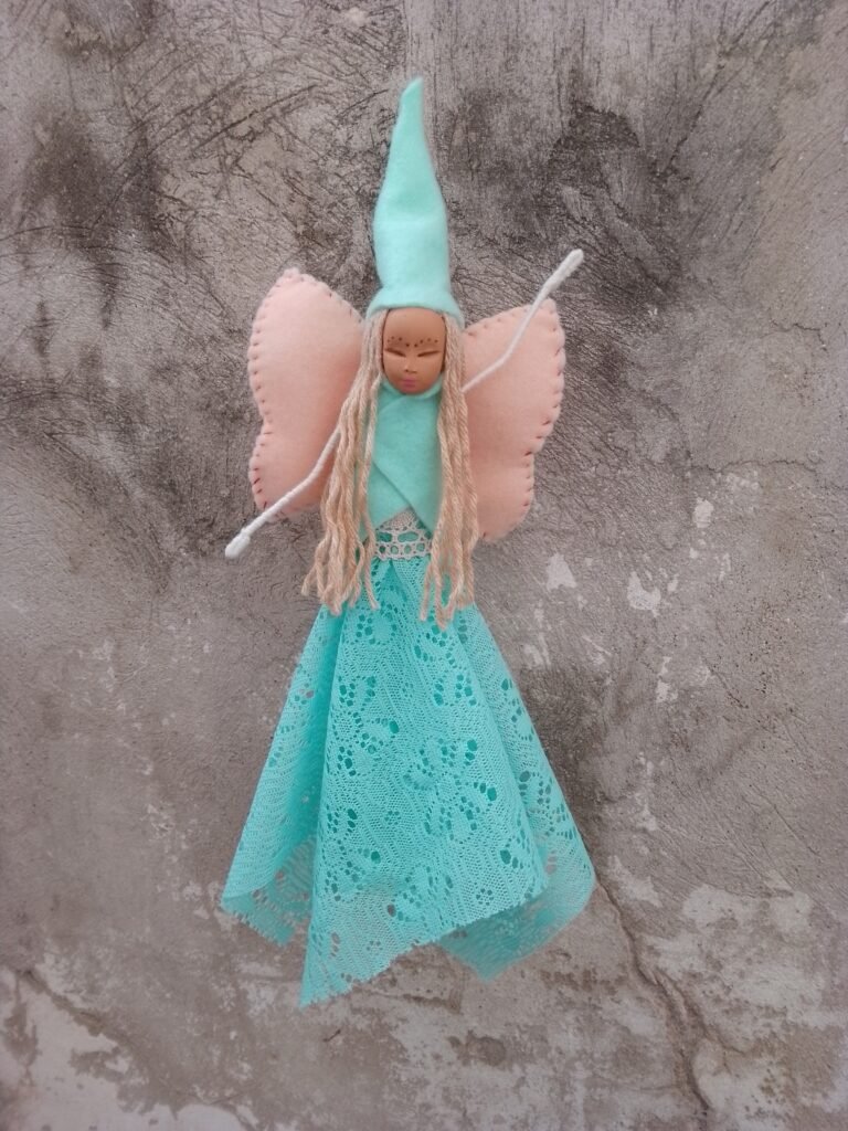 Hada voladora articulada, realizada a mano en porcelana fria, con alma de alambre, vestida en telas y lanas.