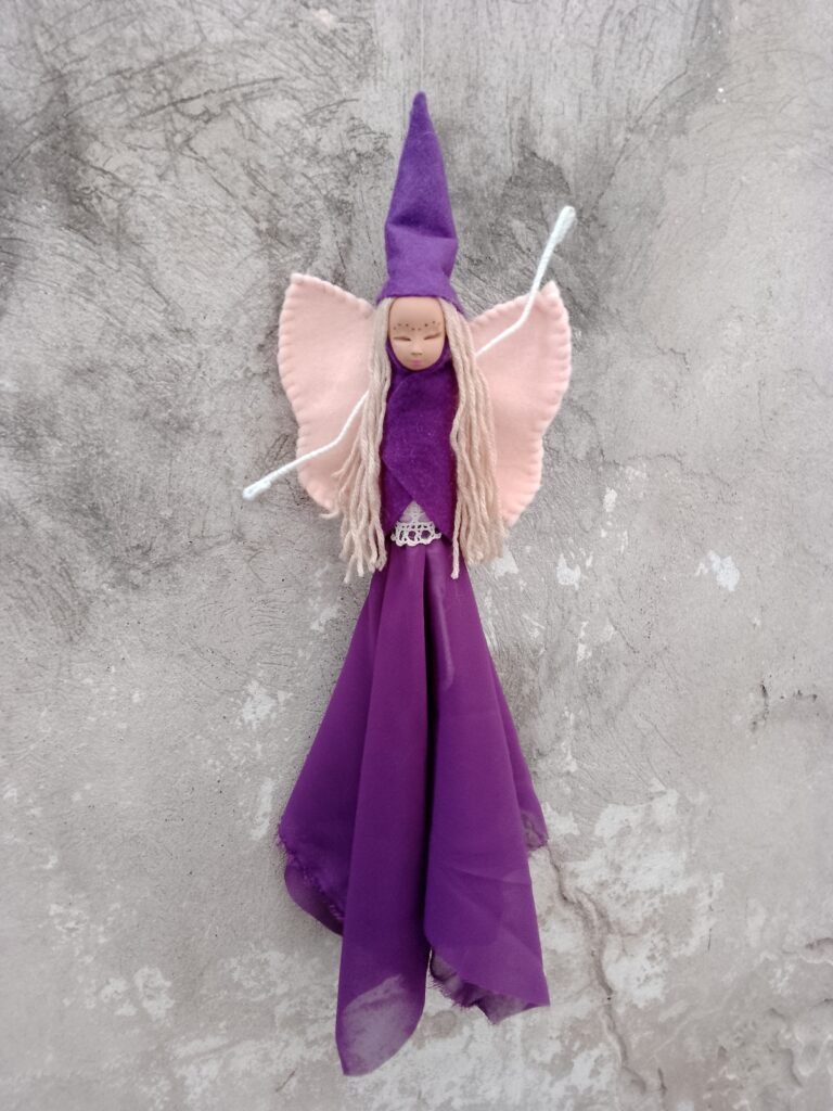 Hada voladora articulada, realizada a mano en porcelana fria, con alma de alambre, vestida en telas y lanas.