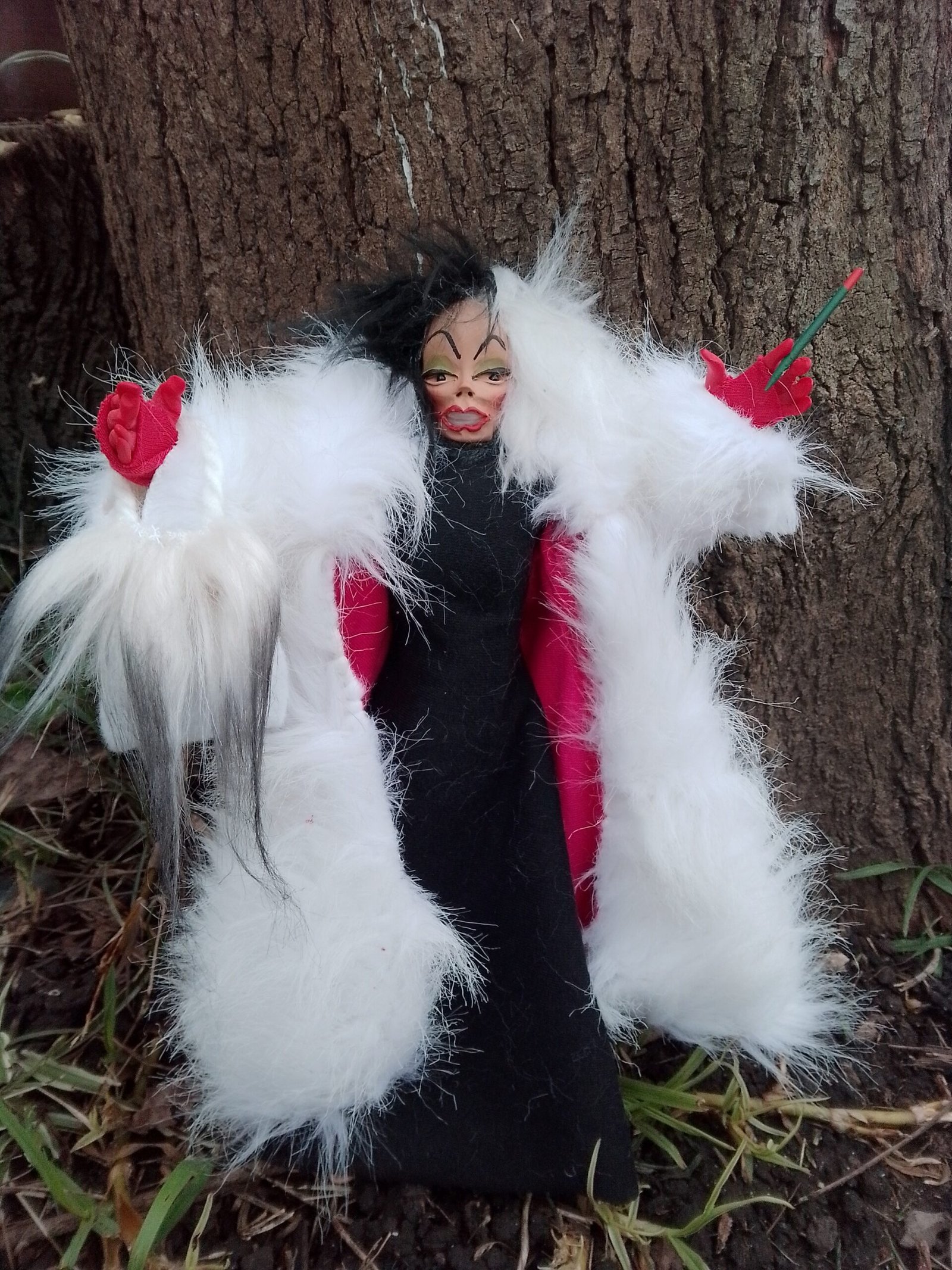 Cruella es articulada, realizada en porcelana fría, alma de alambre y vestida con variadas telas.