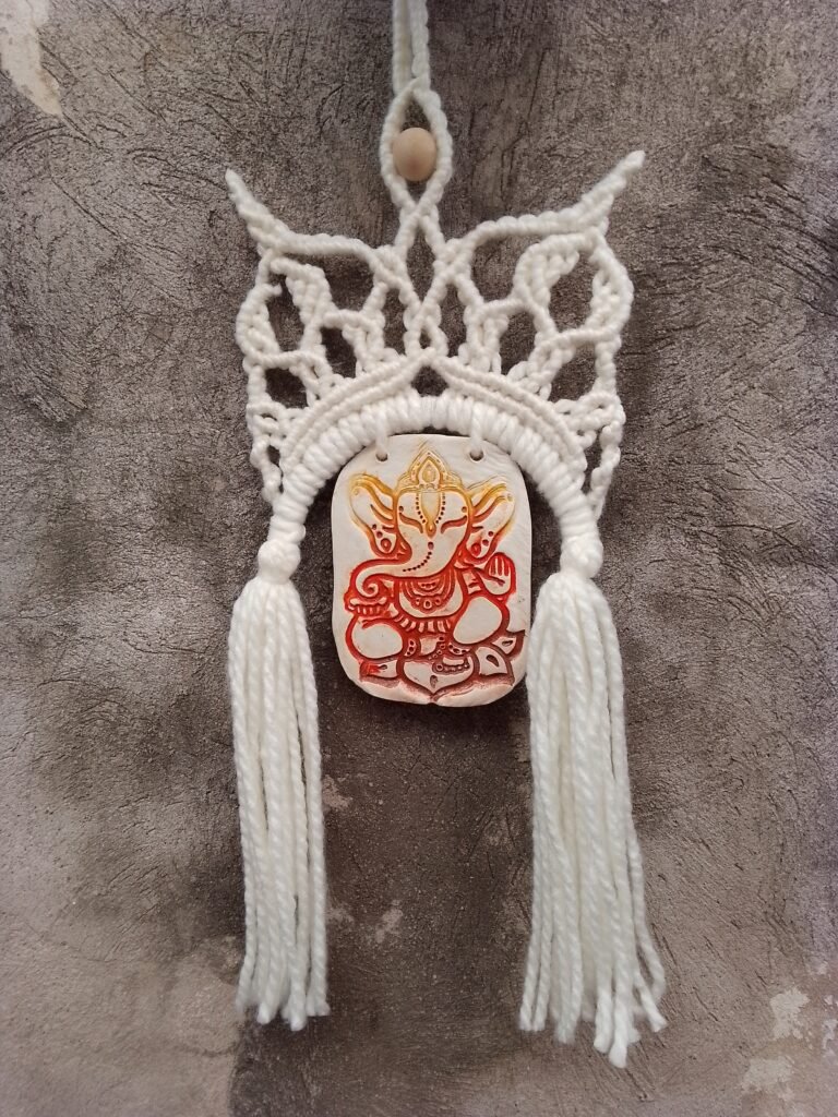 Corona tejida a mano en Macrame en lana y deco Ganesh realizado con ceramica en frio.