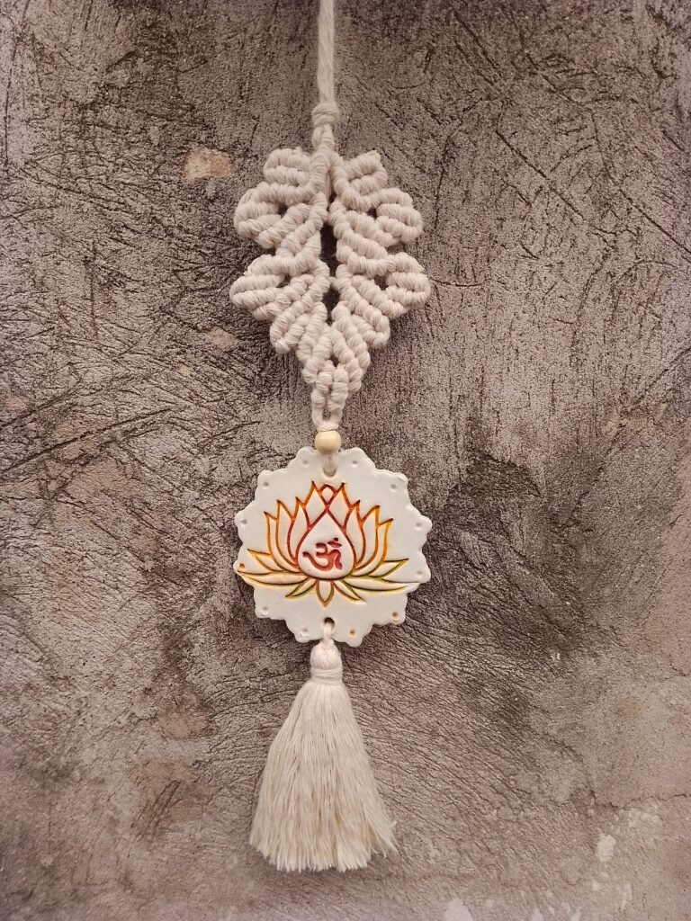Hoja tejida a mano en Macrame con hilo de algodon y, deco Flor de Loto realizada con ceramica en frio.