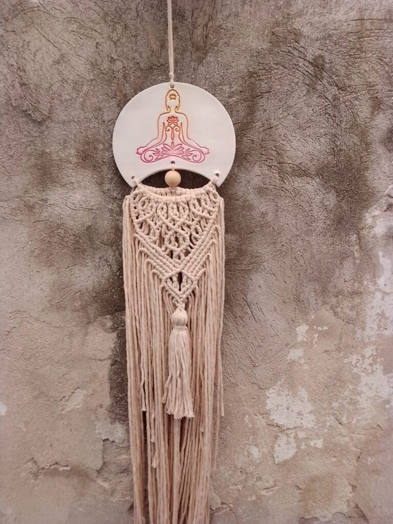 Deco Buda realizado a mano en ceramica en frio, con diseño tejido a mano en Macrame en hilos de algodon.