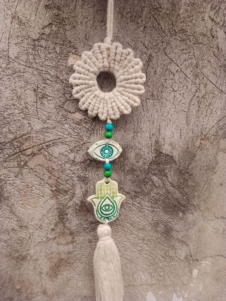 Mandala tejida a mano en Macrame y, decos Ojo Turco y Hamsa realizados con ceramica en frio.