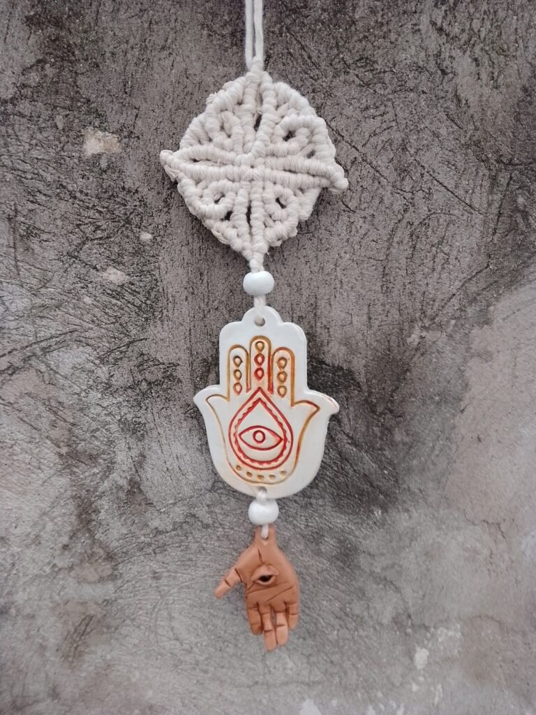 Mandala tejida a mano en Macrame y, decos Hamsa realizado con ceramica en frio.