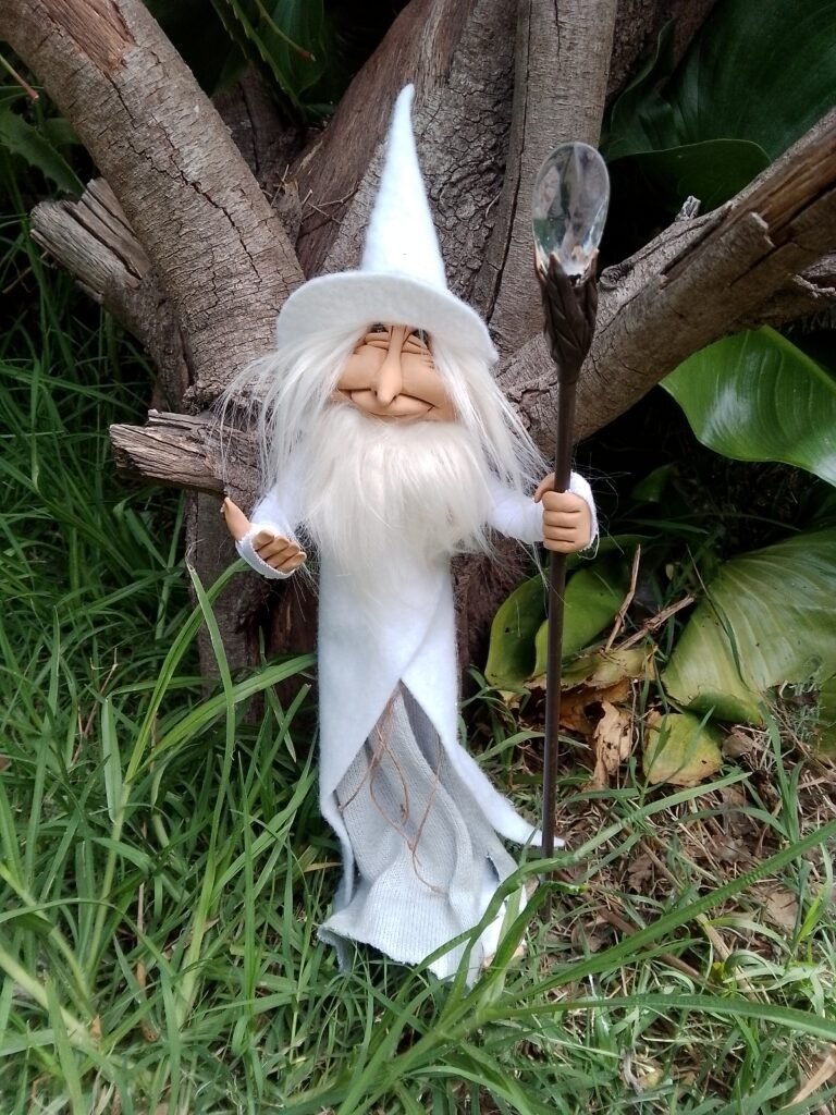 Mago articulado realizado a mano en porcelana fria, con alma de alambre y vestido en telas.