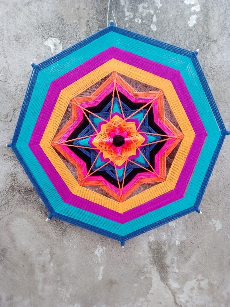 Mandala realizada a mano con lanas y ejes de 50 cm de diametro.