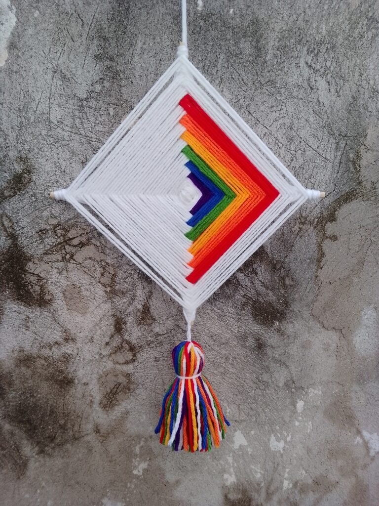 Ojo de Dios Huichol, tejido a mano con lanas y ejes de 25 cm.