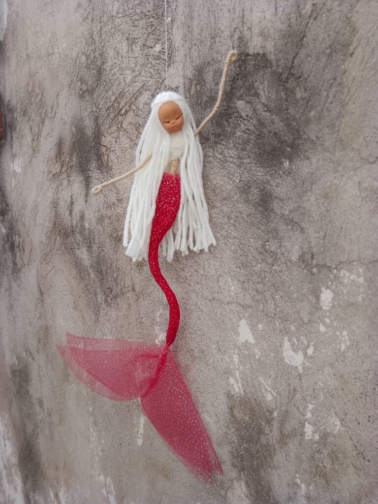 Sirena voladora articulada realizada a mano en porcelana fria, con alma de alambre, vestida en telas y lanas.