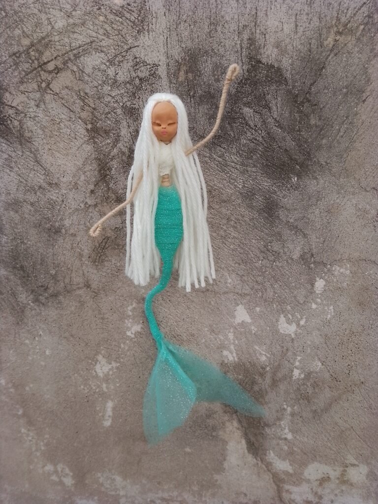 Sirena voladora articulada realizada a mano en porcelana fria, con alma de alambre, vestida en telas y lanas.
